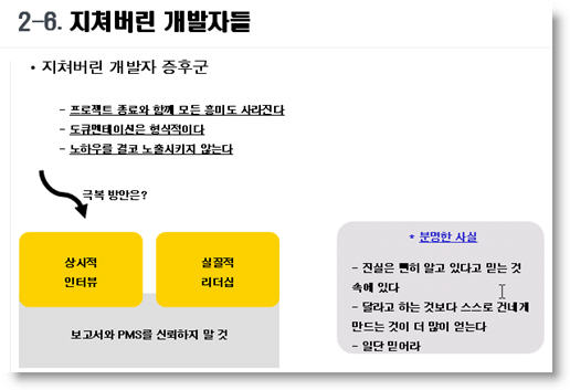 지쳐버린 개발자 증후군에 대해 컨퍼런스에서 자세히 설명하지 못했다. 원래 작성했던 스크립트를 올린다. 지쳐버린 개발자 증후군을 해결하지 못하면 설령 프로젝트의 산출물이 뛰어나게 나왔다 하더라도 제대로 운영할 수 없게 된다. 실무적인 측면에서 가장 해결하기 힘든 이슈이기도 하다.